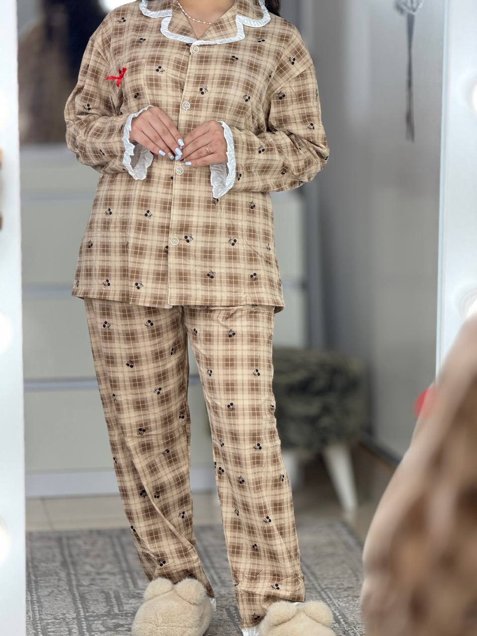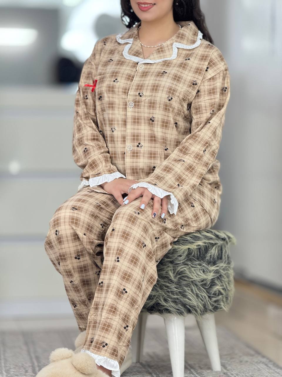 ست دکمه دار استین بلند چهارخونه قهوه ای کد6226