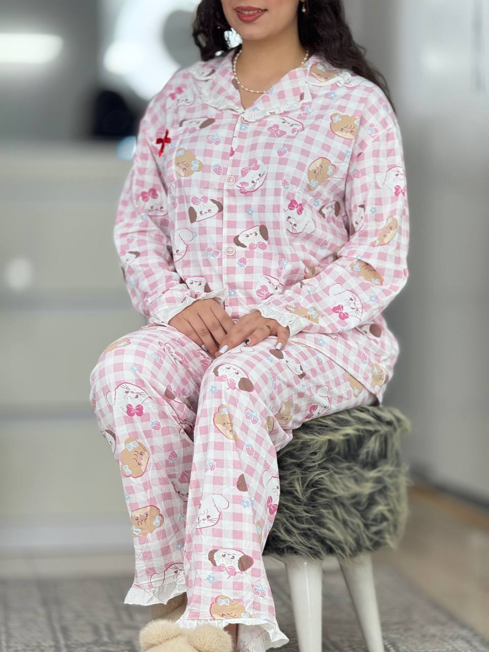 ست دکمه دار استین بلند چهارخونه صورتی کد6227